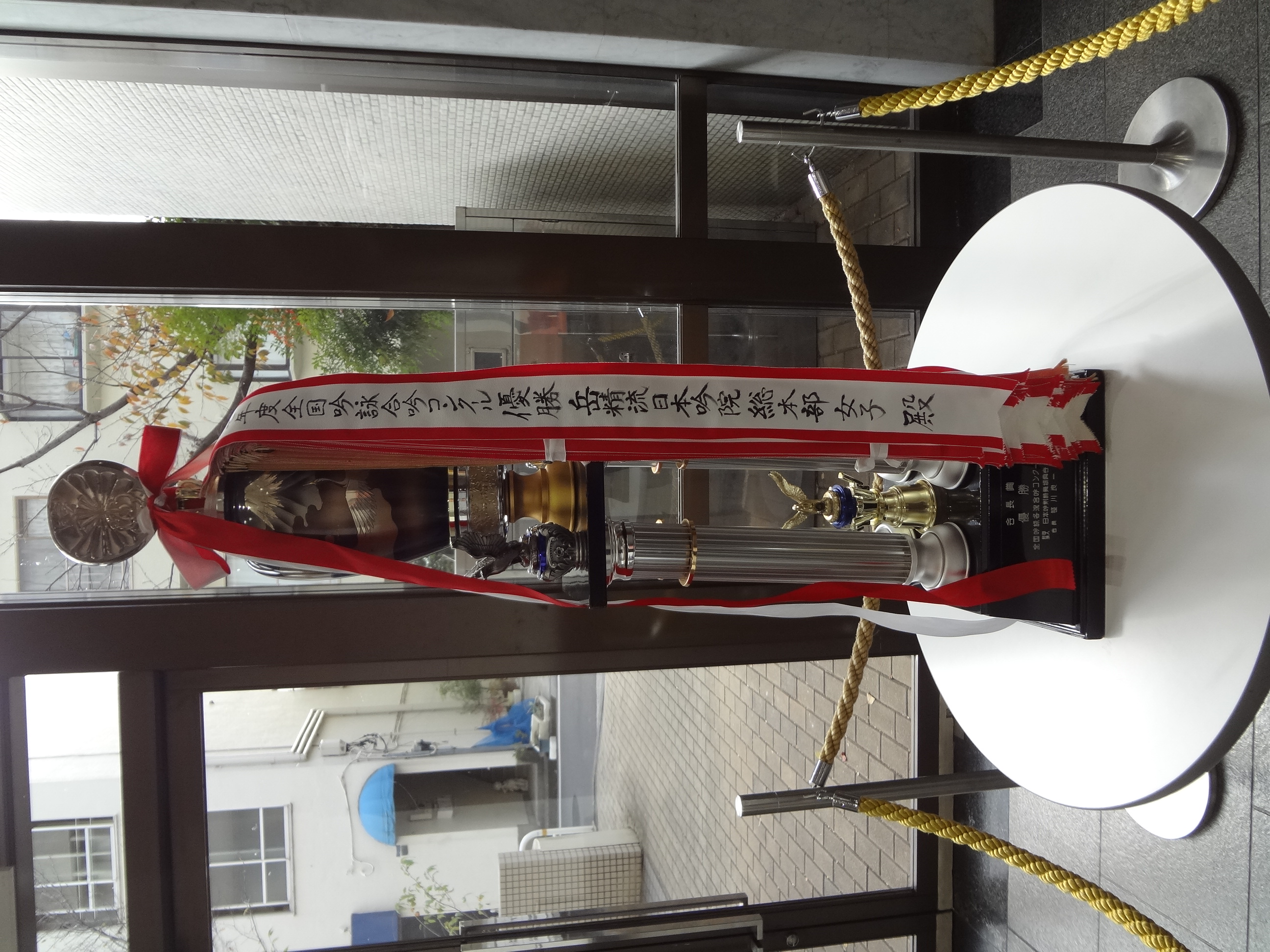 この日は11月に開催された武道館大会参加者も多く参加していることもあり、ロビーには合吟コンクール優勝トロフィー(本部女子チーム)が飾られ、研修終了後には60名に及ぶ大祝賀会が開催されたそうです。参加された皆さん、お疲れさまでした。